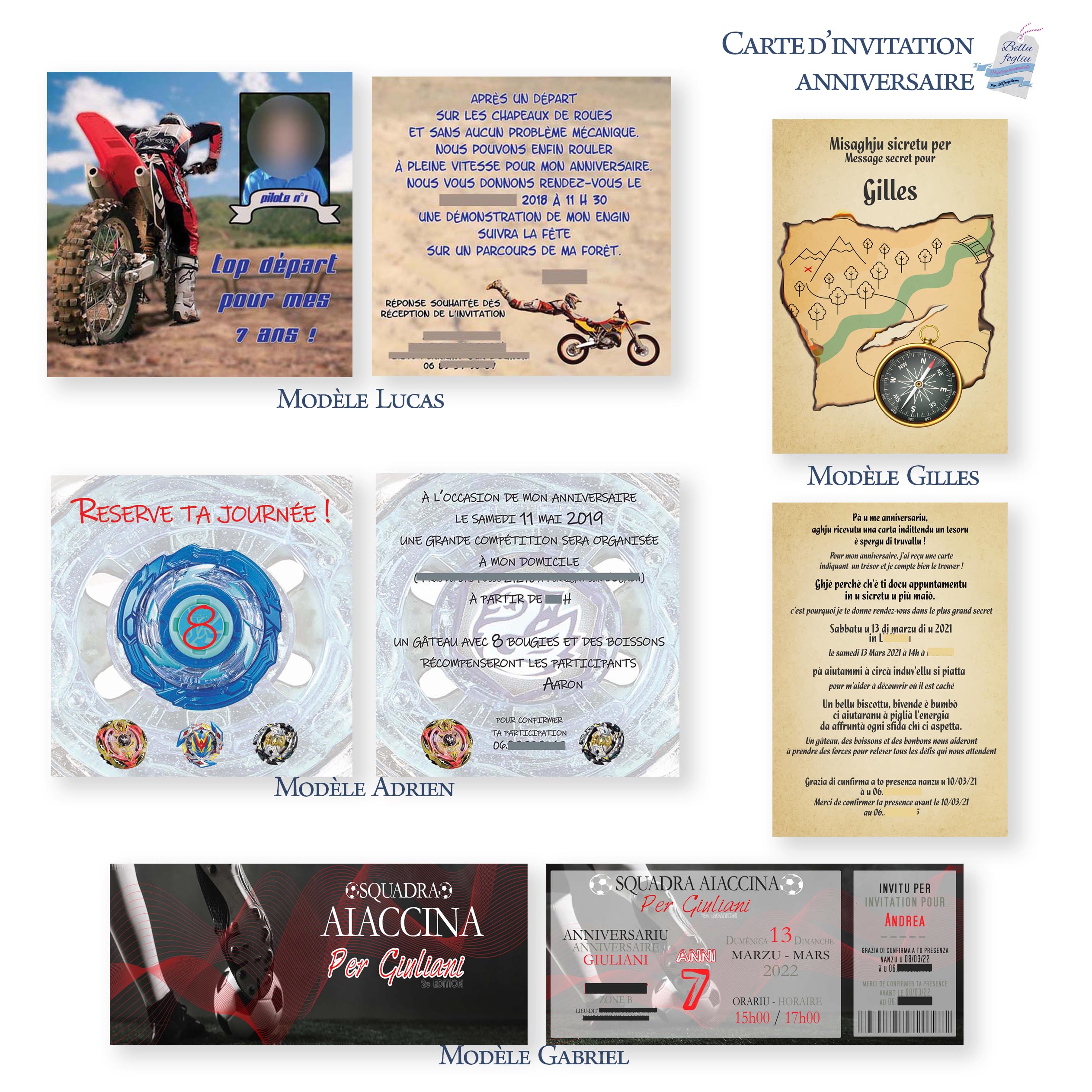 Carte d’invitation anniversaire modèles lucas (motocross), Gabriel (foot), Gilles (chasse aux trésors) et Adrien (toupies)